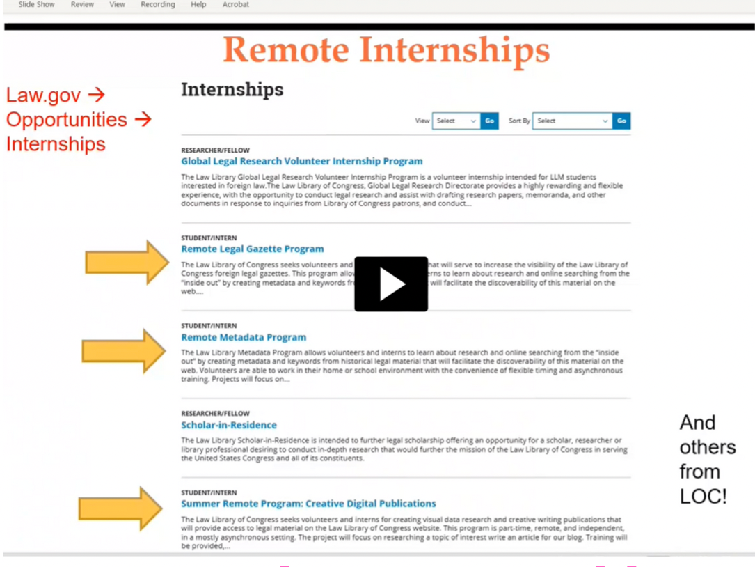 LIS 6472 Seminar in Special Libraries required attendance at a professional and community engagement webinar for special libraries. I chose to attend a lecture presented by a staff member from the Law Library of Congress (LLOC), which was hosted by USF’s Student Organization of Library and Information Science (SOLIS). The lecturer highlighted the LLOC’s digital projects and new technological advancements. Through this presentation, I learned about and applied to the LLOC and was chosen for their internship program. While interning with the Creative Digital Projects Internship, I wrote an article and created inclusive library metadata and linking for the LLOC.